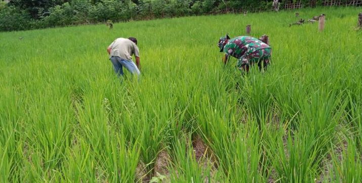 Babinsa Koramil 04/Tabundung Kodim 1601/Sumba Timur Sertu Ejiman membantu petani menyiangi rumput tanaman padi di sawah. Penyiangan rumput dilakukan pada sawah milik Bapa feri
