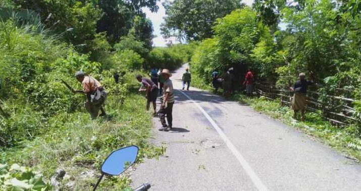 TTS _ Babinsa Koramil 04/Amanatun Utara jajaran Kodim 1621 TTS, Sertu Yosri Tamelan bersama warga binaan bergotong royong melaksanakan pembersihan ruas kanan kiri jalan