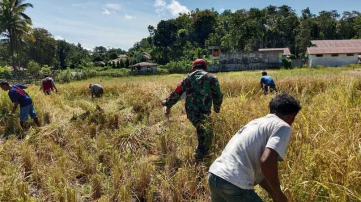 Gentra.co.id Babinsa Koramil 04/ Tabundung jajaran Kodim 1601/Sumba Timur Kopda Kuat Waluyo membantu petani panen padi di Desa Billa,Kecamatan Tabundung, Kabupaten Sumba Timur. Minggu