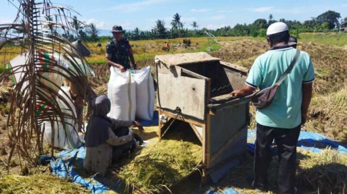 Gentra.co.id Lombok Timur – Babinsa Desa Kertasari, Serda Hunain Akmal dari Koramil 1615-08/Labuhan Haji melaksanakan kegiatan pendampingan terhadap kelompok tani (Poktan) dalam rangka panen