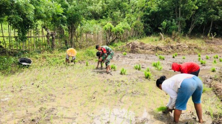 Gentra.co.id –Babinsa Koramil 06/Karera, Kodim 1601/Sumba Timur, Pratu Hezron Wora melaksanakan pendampingan menanam padi, di Desa Nggongi, Kecamatan Karera, Kabupaten Sumba Timur, Senin (21/04/2025)