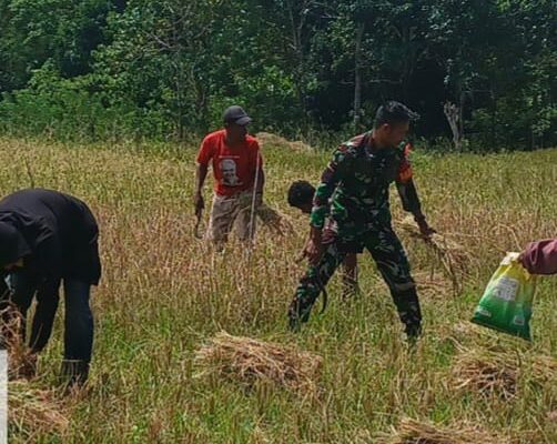 Sebagai wujud nyata dalam mendukung ketahanan pangan di wilayah binaannya,Babinsa Koramil 04/Tabundung Kodim 1601/Sumba Timur Pratu Denis Nderu Peta, melaksanakan kegiatan membantu panen padi