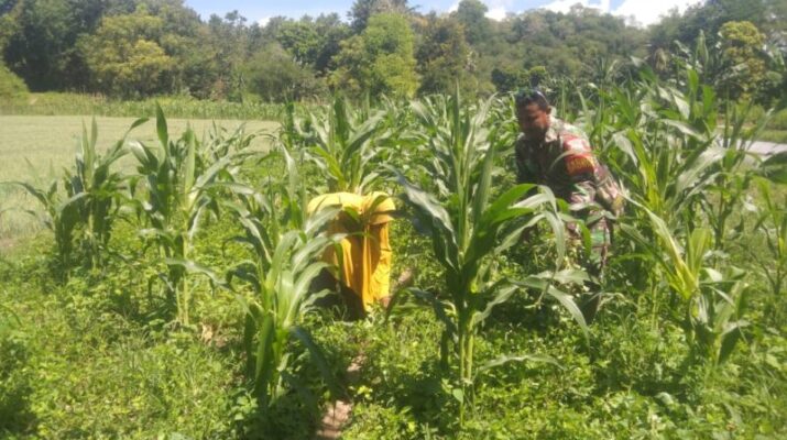 Jaga Pertumbuhan Tanaman Jagung, Babinsa Koramil 05/Waingapu Bantu Bersihkan Rumput