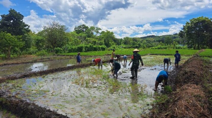 Gentra.co.id –Babinsa Koramil 01/Lewa Kodim 1601/Sumba Timur Kopka Umbu Parahi membantu warga binaan menanam padi, di Desa Matawai Amahu, Kecamatan Kahali, Kabupaten Sumba Timur,