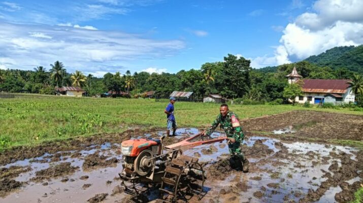 Gentra.co.id –NTT – Ende,Babinsa Koramil 02/Wolowaru Serda Antonius Wae melaksanakan kegiatan bantu petani bajak sawah di Desa Jopu Kecamatan Wolowaru Kabupaten Ende, Sabtu (26/04/2025).