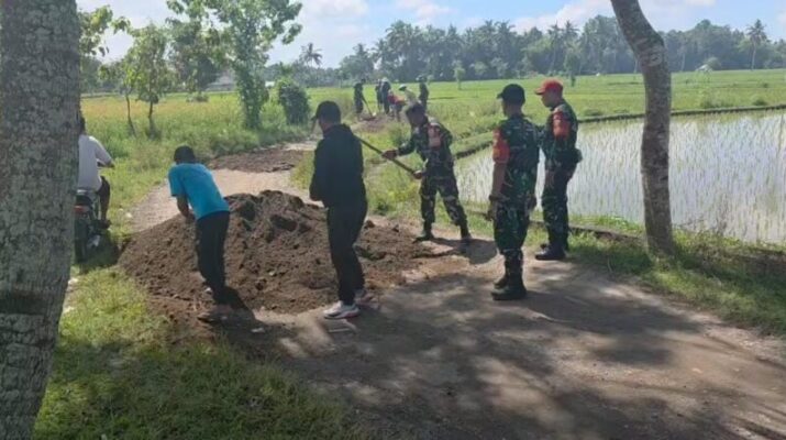 Danramil 1615-09/Sikur Bersama Warga Gotong Royong Timbun Jalan Berlubang di Desa Loyok