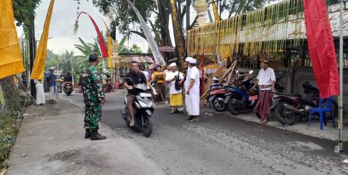 Gentra.co.id –Buleleng, Banjar — Dalam rangka menjaga keamanan dan kelancaran pelaksanaan upacara keagamaan, Babinsa Desa Tampekan, Sertu Gusti Putu Satriawan dari Koramil 1609-06/Banjar, bersama