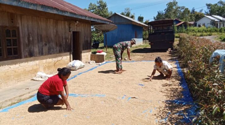 Babinsa Koramil 1612-08/Macang Pacar Bantu Petani Jemur Gabah di Desa Pacar