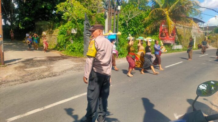 Polres Tabanan-Polsek Marga, Selasa, (29/04/2025), pukul 09.00 s/d 10.30 wita, Bhabinkamtibmas desa marga dauh puri bersinergi dengan petugas pecalang melaksanakan pengamanan dan pengaturan lalin