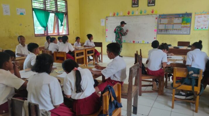 NTT-SIKKA. Babinsa Koramil 1603-04/Kewapante Kodim 1603/Sikka Serda Dedi Setiabudi, memberikan pelajaran matematika dasar dengan menggunakan metode Gasing (Gampang, Asyik, dan Menyenangkan) kepada siswa di