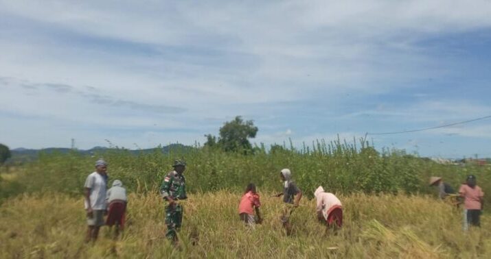 Gentra.co.id –Pratu Aldi Kore Babinsa Koramil 06/Karera Jajaran Kodim 1601/Sumba Timur membantu warga binaan panen padi di Desa Nggongi,Kecamatan Karera ,Kabupaten Sumba Timur. Kamis