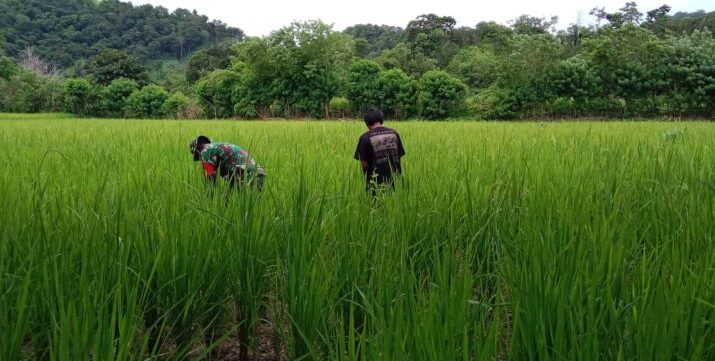 Babinsa Koramil 04/Pahunga Lodu Kodim 1601/Sumba Timur Sertu Ejiman melakukan pendampingan dalam menjaga kebersihan gulma pada tanaman padi, Bertempat di Desa Pinduharani, Kecamatan Tabundung,