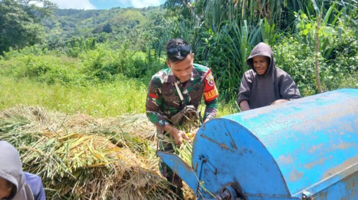 Babinsa Koramil 04/Tabundung Dampingi Petani Rontok Padi di Desa Praingkareha