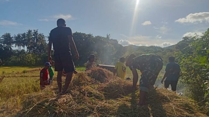 Gentra.co.id –Wujud kepedulian terhadap masyarakat binaannya, Babinsa Koramil 03/Pahunga Lodu, jajaran Kodim 1601/Sumba Timur, Pratu Antonius Ndima, turut membantu petani menjemur padi di Desa