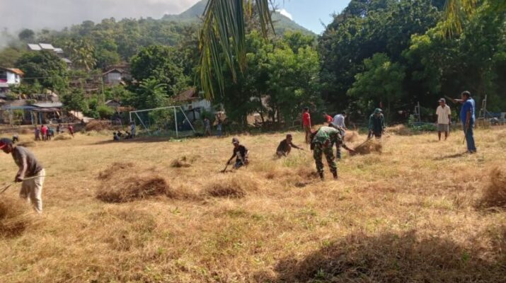 Babinsa Bersama Masyarakat Gotong Royong Dalam Pembersihan Lapangan Sepak Bola.