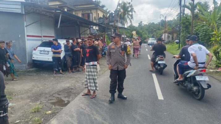 Polres Tabanan-Polsek Marga, Kamis, (15/05/2025), pukul 11.45 s/d 13.30 wita, Bhabinkamtibmas desa tua melaksanakan pengamanan dan pengaturan lalin dalam rangka kegiatan upacara Pitra Yadnya