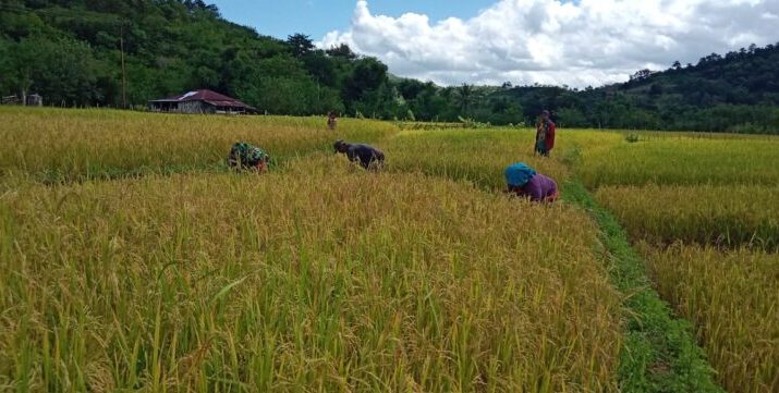 NTT – Sumba Timur,Dalam rangka mendukung ketahanan pangan di wilayah binaannya, Babinsa Koramil 04/Tabundung, Kodim 1601/Sumba Timur Sertu Ejiman, melaksanakan kegiatan pendampingan panen padi