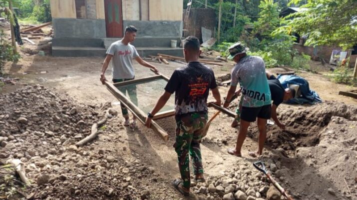 NTT – Ende/Detukuli, Babinsa koramil 04/Maurole Praka Khairil Mustafa melaksanakan kegiatan membantu masyarakat membuat pondasi rumah milik warga Binaannya di desa Wolomuku kecamatan Detukeli,