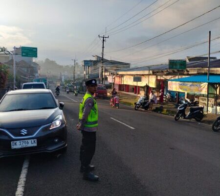 Tingkatkan Kedisiplinan, Keamanan dan Kelancaran Lalu Lintas, Polsek Pupuan Laksanakan Giat Strong Point Pagi
