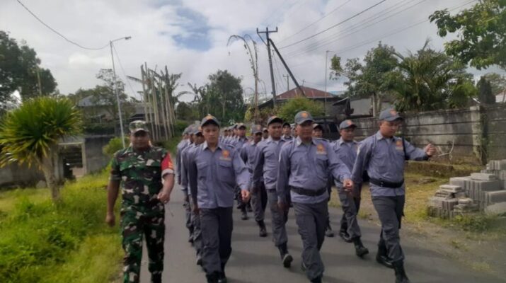 Bangli – kegiatan Pelatihan Anggota Linmas berupa Peraturan Baris Berbaris (PBB) yang diberikan oleh Kopda I Made Rida K.P. selaku Babinsa Desa Selulung, Kecamatan
