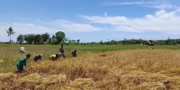 Wujukan Kepedulian Babinsa, Turun Langsung Ke Sawah Bantu Petani Panen Padi.