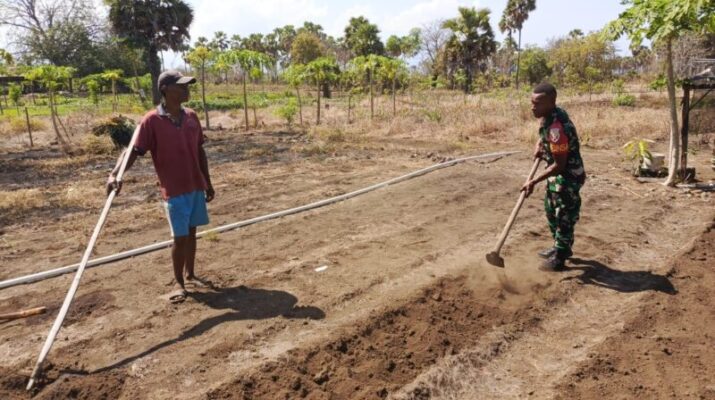 Flotim – Sebagai salah satu upaya mendorong masyarakat dalam mewujudkan ketahanan pangan, Babinsa Desa lewokeleng Koramil 1624-02/Adonara Pratu Emanuel N B membantu petani dalam