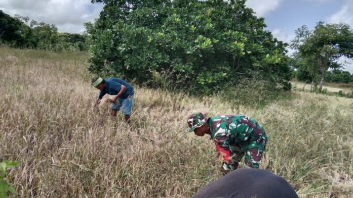 NTT- Sumba Timur,Babinsa Koramil 02/Rindi Umalulu, jajaran Kodim 1601/Sumba Timur, Pratu Ardiamos Kabunang, turut serta membantu petani dalam kegiatan panen padi di Desa Hanggaroru,