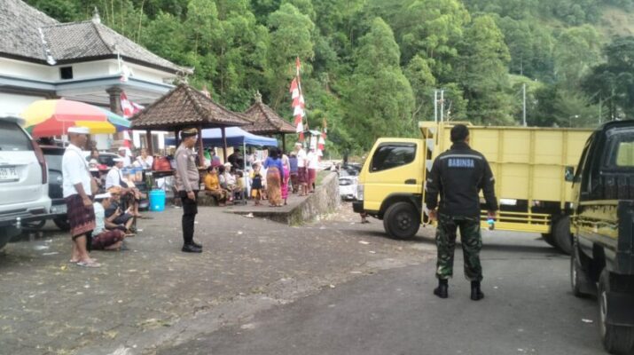 Bangli – Dalam rangka mendukung kelancaran pelaksanaan Upacara Upasaksi Karya/Piodalan di Pura Pancering Jagat, Desa Trunyan, Kecamatan Kintamani, Babinsa Desa Landih, Koramil 01/Bangli, Kodim