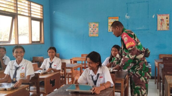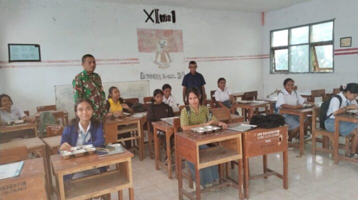 Kupang Timur – Babinsa Koramil 1604-02/Camplong, Koptu Samuel Salawono, melakukan pemantauan pelaksanaan program makan gratis dari Presiden Republik Indonesia di tiga sekolah wilayah Kupang