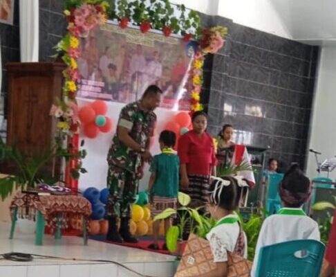 NTT-AMARASI – Dalam semangat mendukung pendidikan sejak dini, Babinsa Ramil 1604-04/Amarasi Serda Yornam T. Kase menghadiri acara pelepasan dan syukuran siswa-siswi PAUD dan TK