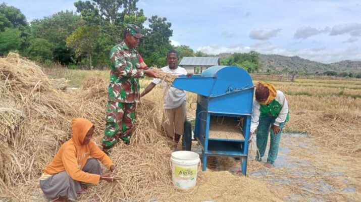 Babinsa Bangun Semangat Warga Di Bawah Terik Matahari, Bantu Rontokkan Padi Bersama Petani.