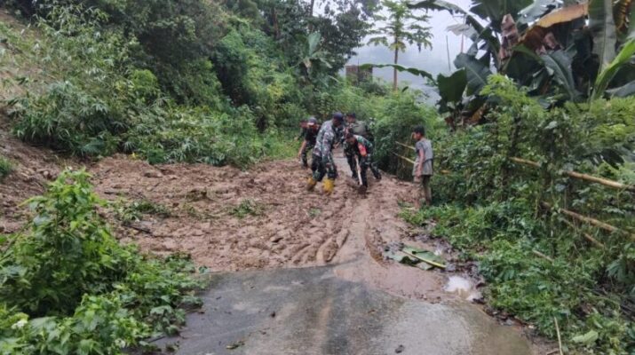 NTT-SIKKA Personil Babinsa Koramil 1603-03/Paga, Kodim 1603/Sikka, melakukan aksi cepat tanggap dengan membersihkan jalan yang tertutup longsor di Kecamatan Tanawawo, Dusun Wulu, Desa Detubinga.