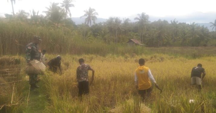 Wujud Nyata Pendampingan Babinsa Dalam Membantu Petani Panen Padi.