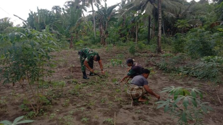 NTT – Ende/Nangapanda, Anggota Koramil 01/Ende Kopda Faisal Indrus melaksanakan pembersihan rumput yang tumbuh di tanaman kacang ijo yag berada di lahan milik Ibu Goreti di