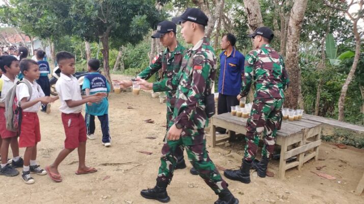 Wujud Kepedulian, Pos Nananoe Yonif 741/GN Bagikan Bubur Kacang Hijau kepada Siswa Perbatasan