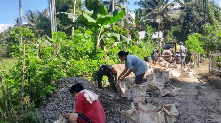 NTT-SIKKA Babinsa Koramil 1603-01/Alok Kodim 1603/Sikka, Sertu Benendito, melaksanakan kegiatan kerja bakti pengecoran jalan setapak di Desa Nita, Kecamatan Nita, Kabupaten Sikka. Kegiatan ini