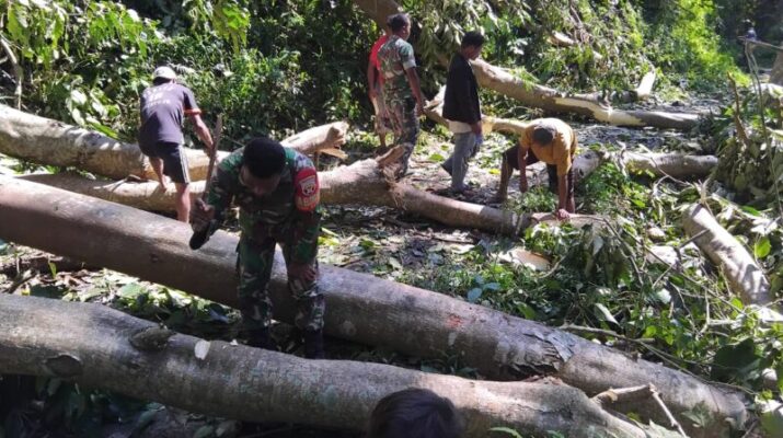 NTT-SIKKA Babinsa Koramil 1603-03/Paga Kodim 1603/Sikka, Serda Nelson dan Praka Bachrudin Amir, bersama masyarakat melaksanakan gotong-royong pembersihan pohon tumbang akibat curah hujan dan angin