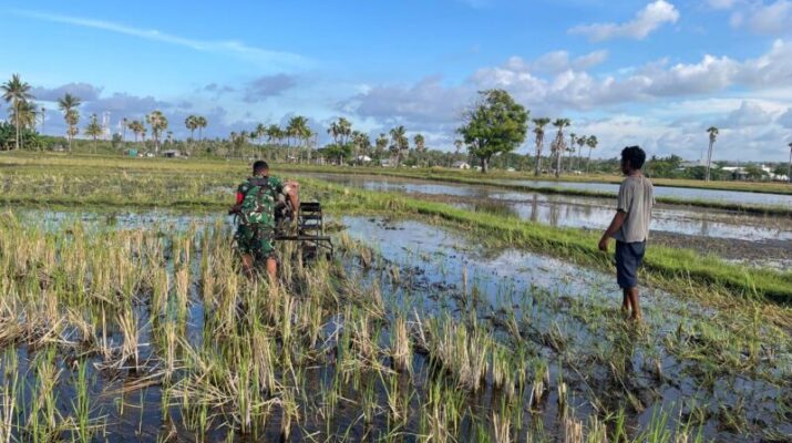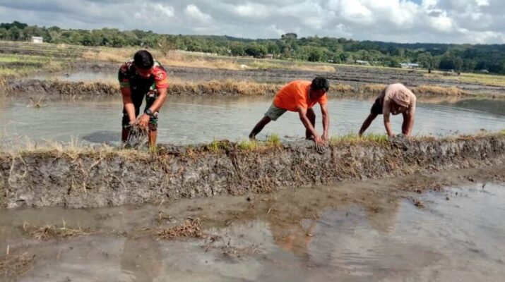 NTT – Sumba Timur,Babinsa Koramil 03/Pahunga Lodu, Kodim 1601/Sumba Timur Pratu Antonius Lapu melaksanakan pendampingan upsus kepada petani membantu membuat pematang sawah seluas kurang