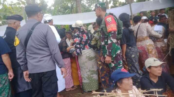 Klungkung, – Babinsa Kusamba Peltu Made Rai Darmikayasa dan Koptu Nyoman Suartawan Babinsa Dawan Kelod ikut serta menghadiri berlangsungnya upacara keagamaan melaspas yang digelar