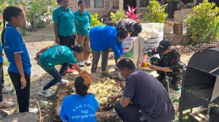 Belu – Pos Mahen memberikan pembekalan pembuatan pupuk organik kepada Mahasiswi KKN dari Prodi PG-PAUD STKIP Nusa Timor di Desa Lakanmau, Kecamatan Lasiolat, Kabupaten