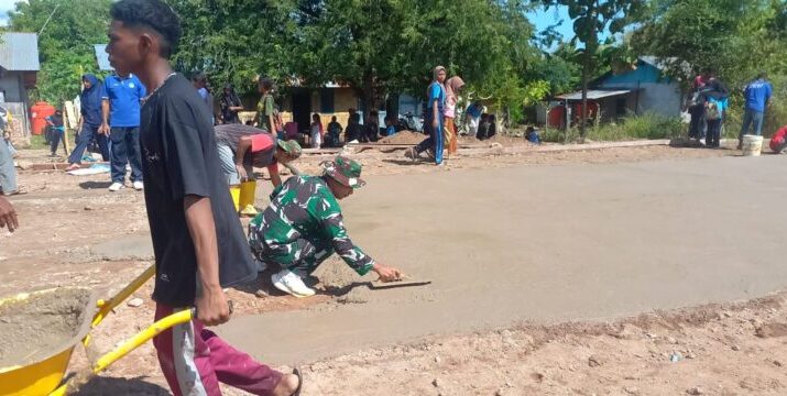Omesuri, Lembata — Babinsa Koramil 1624-04/Omesuri, Pratu Armindo Monteiro, melaksanakan monitoring wilayah sekaligus turut serta dalam karya bakti pembangunan lapangan voli bersama masyarakat di