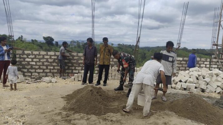 Bersama Warga, Babinsa Kodim 1613 Laksanakan Gotong Royong Gereja Wailolung