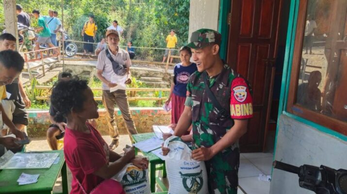 Ende – Babinsa Koramil 1602-04/Maurole, Praka Khairil Mustafa, melaksanakan tugas pengawasan dan pengamanan dalam kegiatan penyaluran Bantuan Pangan Cadangan Beras Pemerintah (CBP) di Desa