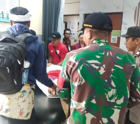 KARANGASEM – Babinsa Desa Sebudi Koramil 1623-06/Selat Sertu Nyoman Rembun turut membantu evakuasi korban meninggal dunia saat mendaki Gunung Agung, di Parkiran Pura Pasar