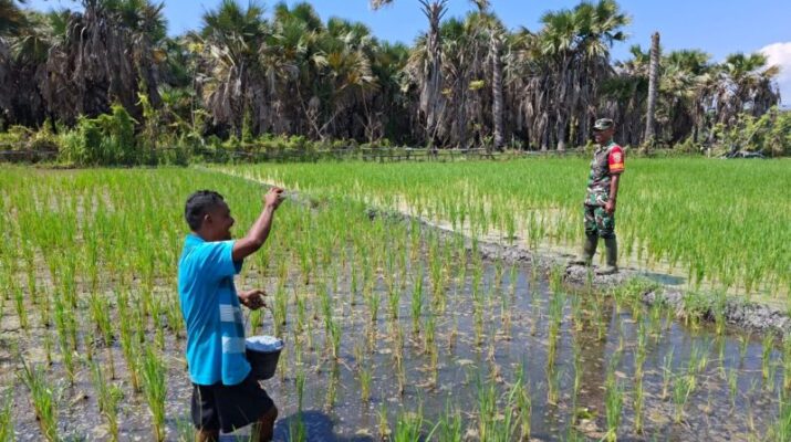 Sertu Densius Berno Bersama Poktan Nanga Kera Laksanakan Pemupukan Padi Sawah