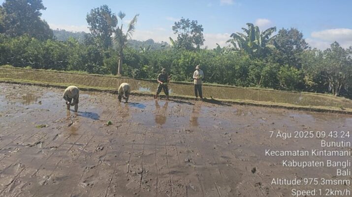Bangli – Sebagai bentuk nyata dukungan terhadap program ketahanan pangan nasional, Babinsa Desa Bunutin, Serka I Nyoman Lodra, melaksanakan kegiatan pendampingan penanaman padi bersama
