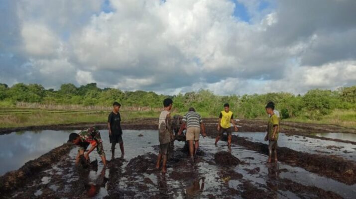 NTT – Sumba Timur. Memasuki masa tanam kedua, Babinsa Koramil 03/Pahunga Lodu, Kodim 1601/Sumba Timur. Pratu Anton Ndima membantu petani membuat dan memperbaiki pematang
