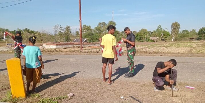 Belu – Pos Salore Satgas Yonif 741/GN bersama masyarakat setempat melaksanakan pemasangan umbul-umbul di Desa Tulakadi, Kecamatan Tasifeto Timur, Kabupaten Belu. Minggu (10/08/2025). Umbul-umbul