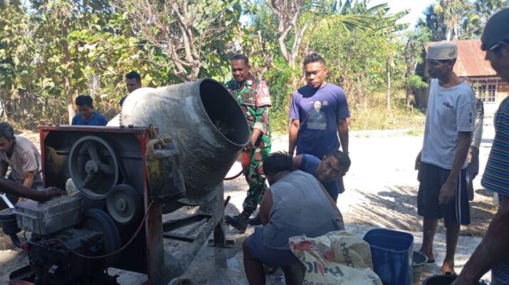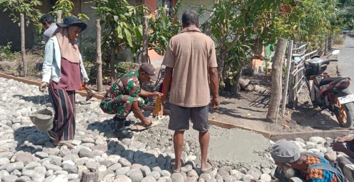 Rote Ndao – Babinsa Koramil 02/Pantai Baru Kodim 1627/Rote Ndao Serda Melki Fanggidae Karya Bakti Bersama warga bangun jalan rabat beton di Desa Lenupetu