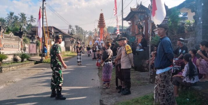 Bangli – Dalam rangka menjaga keamanan dan ketertiban selama pelaksanaan upacara Ngaben massal, Babinsa Desa Undisan Koramil 1626-03/Tembuku Kodim 1626/Bangli, Serda I Wayan Budiarta,